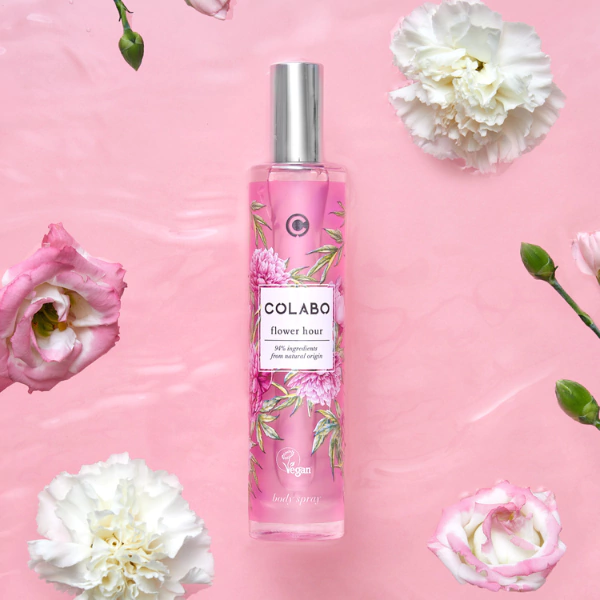 Um spray corporal vegano enriquecido com provitamina B5 para sua pele (D-pantenol) você vai explorar a ideia de desenvolvimento sustentável e a inspiradora fragrância FLOWER HOUR:
